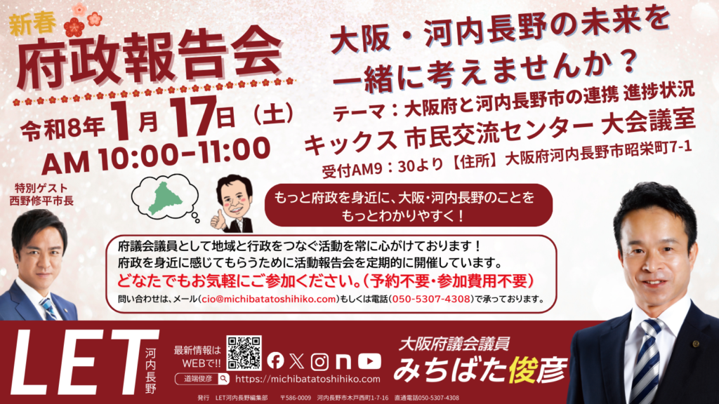 【河内長野市ニュース】新春 府政報告会開催のお知らせ【1月17日AM10:00-11:00】 – みちばた俊彦(ミチバタトシヒコ) | 選挙ドットコム