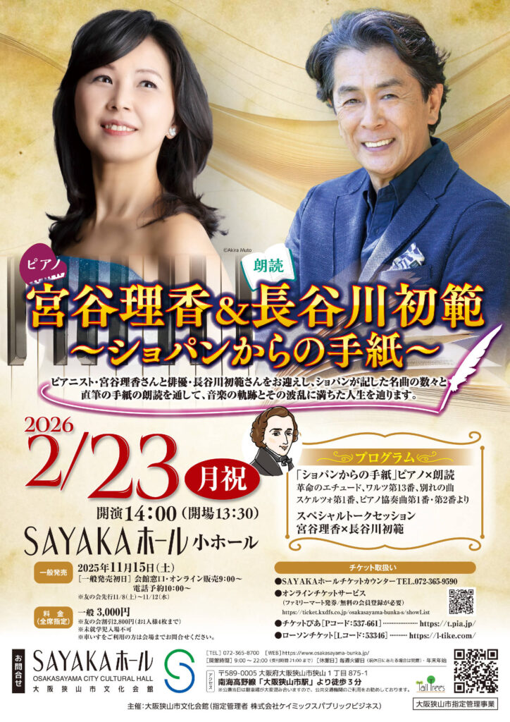 【大阪狭山びこ】【2026年2月23日】ピアノと朗読で楽しむショパンの名曲!「宮谷理香&長谷川初範~ショパンからの手紙~」がSAYAKAホールで開催!