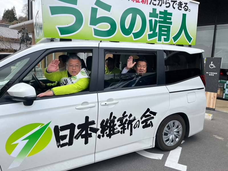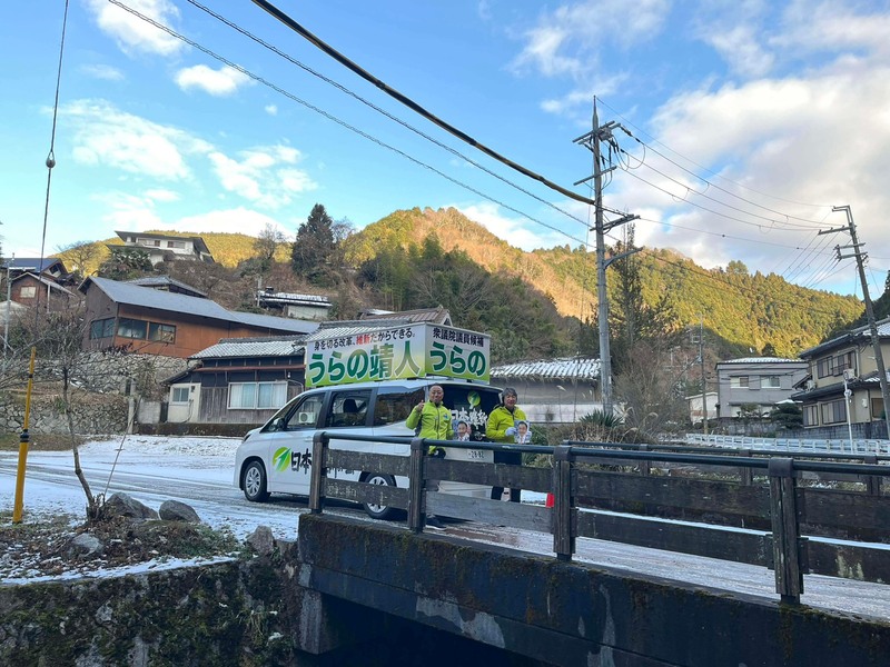 【千早赤阪村ニュース】浦野号は、鈴木憲大阪府議会議員と田中祐二太子町長を乗せて、雪の残る太子町から千早赤阪村へと浦野… – 選挙ドットコム