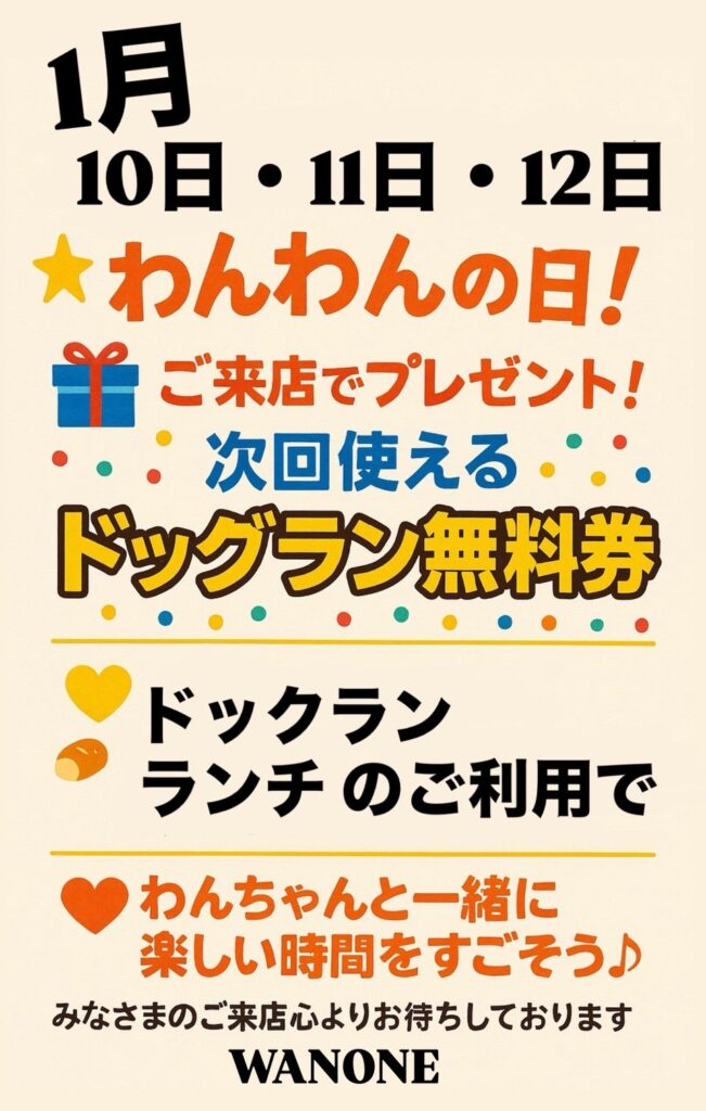 【大阪狭山びこ】【2026年1月10日/11日/12日】今熊4丁目のドッグラン&カフェ「 WANONE」で、次回使える『ドッグラン無料券』プレゼント!